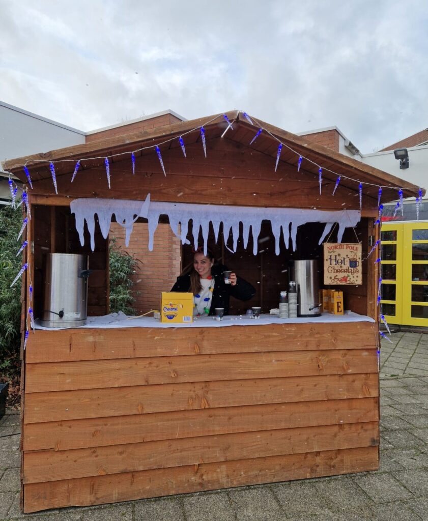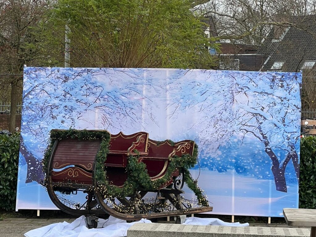 Op het schoolplein stonden sfeervolle kraampjes en een echte arrenslee, waar leerlingen foto’s konden maken met hun vrienden.