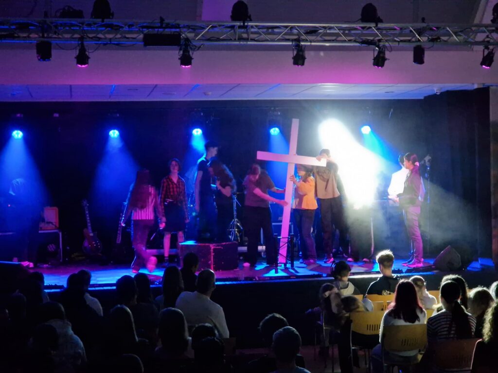 Vorige week stond natuurlijk in het teken van Pasen en de paasvoorstelling die door onze leerlingen is gemaakt. Het verraad van Jezus werd uitgebeeld en er kon worden gestemd voor de vrijlating van Jezus of de moordenaar Barabbas. Het laat zich raden wie deze stemming won en Jezus werd afgevoerd door de conciërges.
